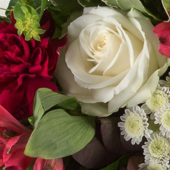 A sweet gift bag of ruby red alstromeria and carnations, white rose, mini gerbera and lisianthus.